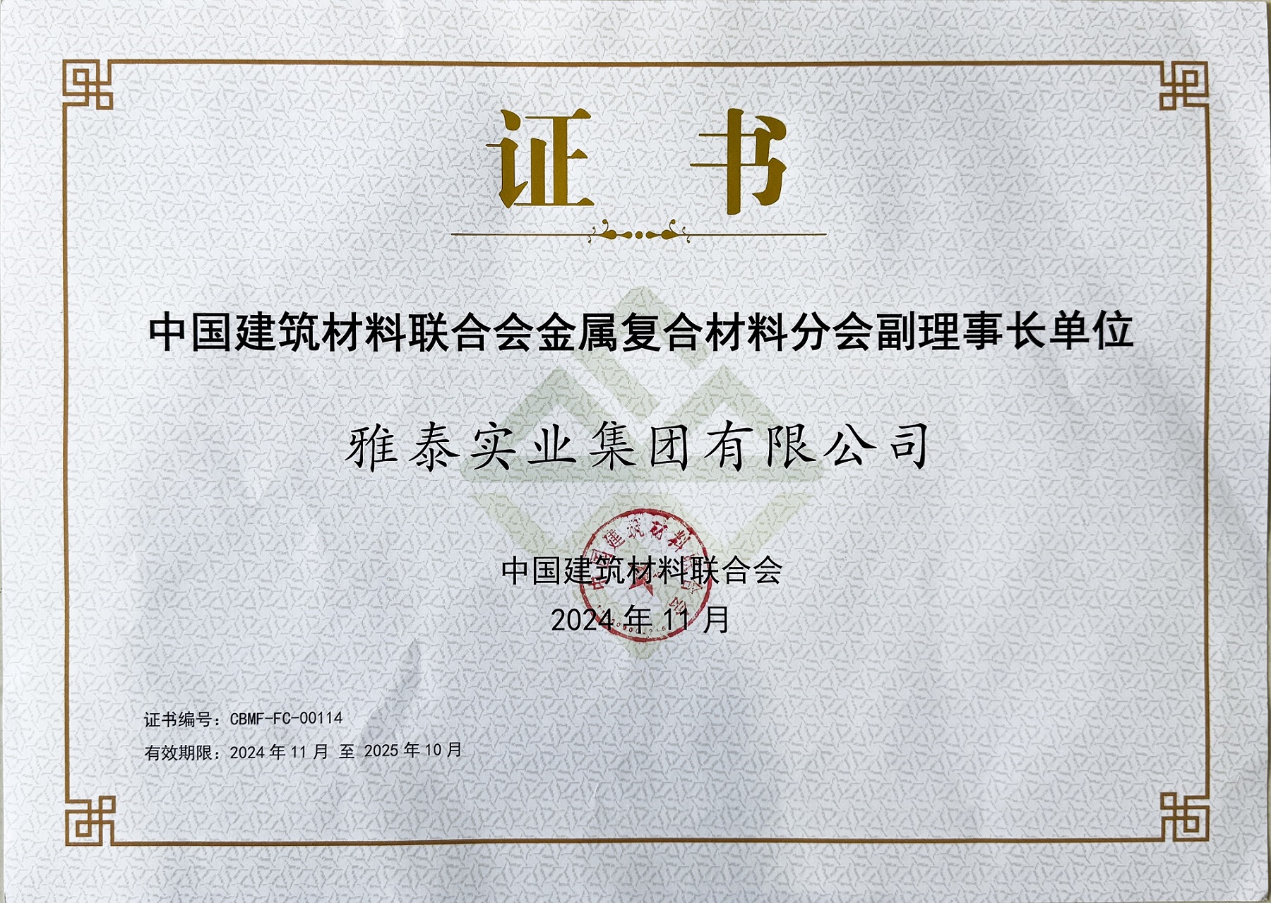 同時(shí),雅泰實(shí)業(yè)集團(tuán)作為幕墻行業(yè)優(yōu)秀的國(guó)內(nèi)老字號(hào)品牌,也長(zhǎng)年擔(dān)任著中國(guó)建筑材料聯(lián)合會(huì)理事、金屬復(fù)合材料分會(huì)副理事長(zhǎng)等角色。