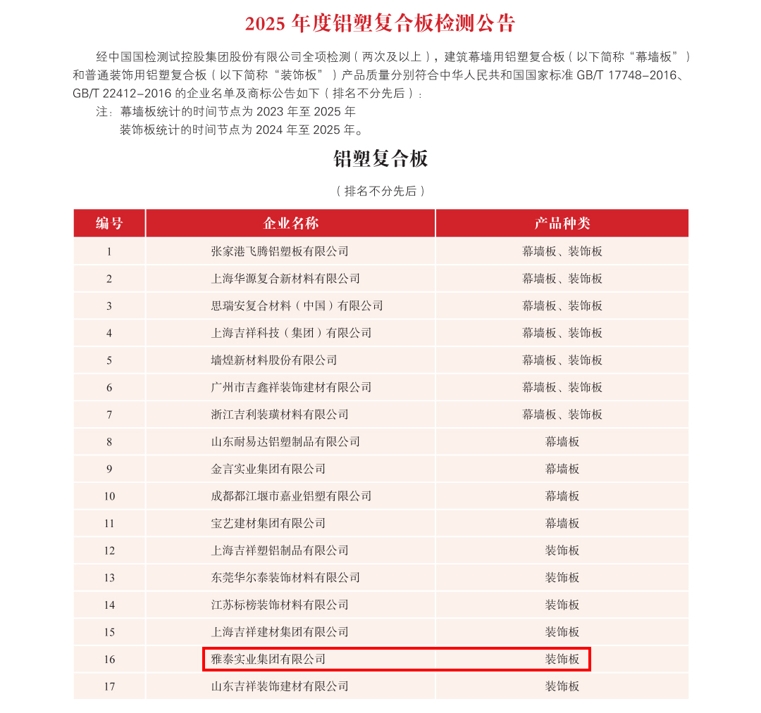 雅泰實(shí)業(yè)集團(tuán)2025年度多項(xiàng)產(chǎn)品全項(xiàng)檢測(cè)合格公示