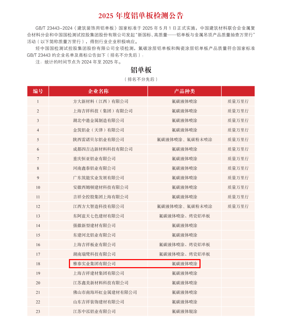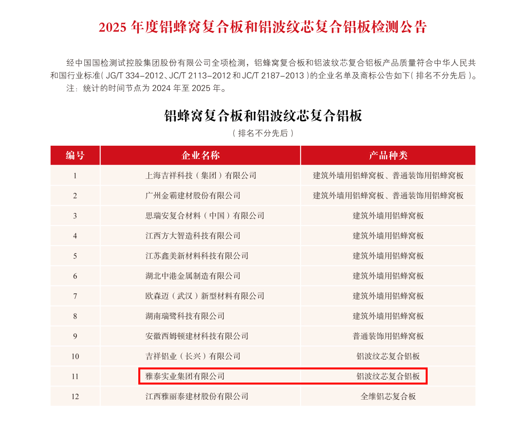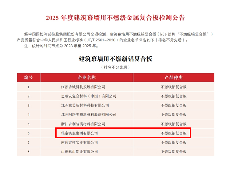 為加強(qiáng)金屬?gòu)?fù)合材料行業(yè)品質(zhì)建設(shè),提高行業(yè)整體質(zhì)量,金屬?gòu)?fù)合材料分會(huì)聯(lián)合中國(guó)國(guó)檢測(cè)試控股集團(tuán)股份有限公司對(duì)符合全項(xiàng)檢測(cè)要求的鋁塑復(fù)合板、鋁單板、建筑裝飾用不燃級(jí)金屬?gòu)?fù)合板、鋁蜂窩復(fù)合板和鋁波紋芯復(fù)合鋁板等生產(chǎn)企業(yè)頒發(fā)2025 年度產(chǎn)品合格證,具體公告如下:
