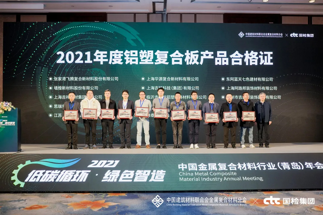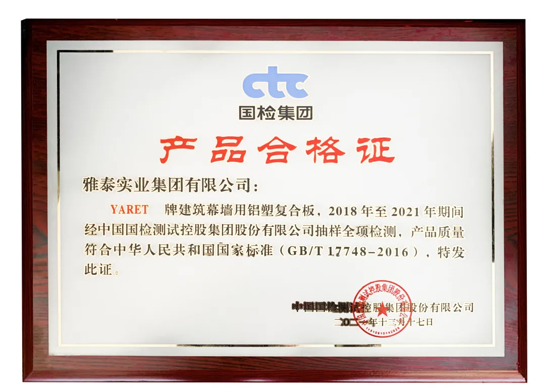 會上,對2021年度行業(yè)優(yōu)秀的產(chǎn)品與企業(yè)進行了表彰頒獎——雅泰 YARET 牌鋁塑復合板,于2018年至2021年期間經(jīng)中國建材檢驗認證集團股份有限公司抽樣全項檢測,產(chǎn)品質(zhì)量符合中華人民共和國國家標準(GB/T 17748-2016),榮獲2021年度CTC認證產(chǎn)品合格證。