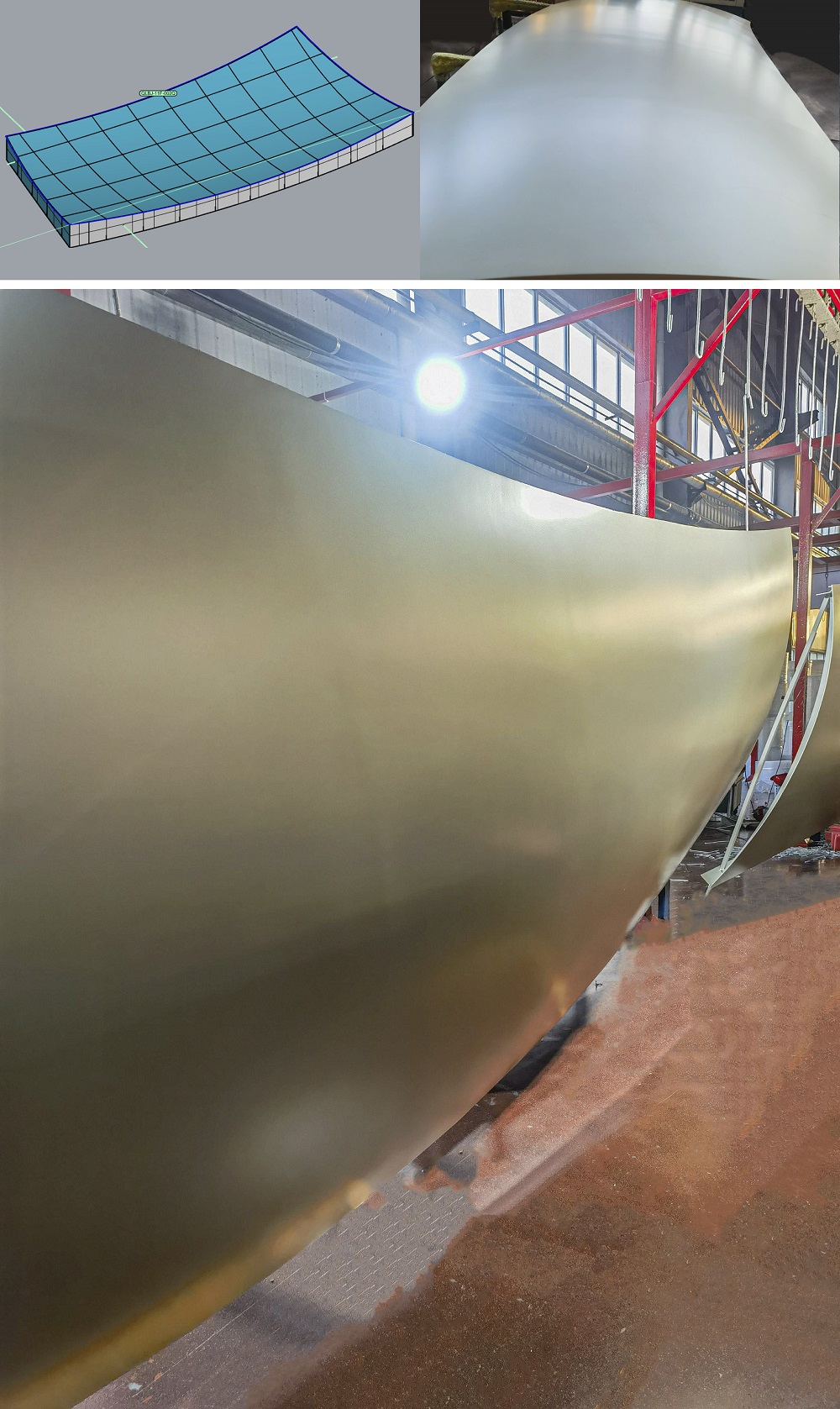 值得一提是的主樓八根香檳色鋁板巨型角柱,該工藝為鋁幕墻制造工藝中最復雜的雙曲,每根柱子由54個雙曲單體構成,每個單體面積約8平方,雙曲面經(jīng)過工匠們精心打磨,才成就流暢的單元體線條。難度最大的是,所有拼成柱體的板件尺寸大多為特大1800*6000mm異型板,采用單元板式設計,每件板超寬、超長,單件板重達130kg,相當于2個成年人的重量。每次鈑金、轉序、從噴涂隧道順利噴漆完成,都十分的小心,傾注雅泰所有操作者的心血。
